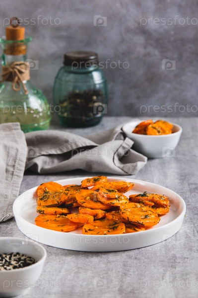 Кусочки жареной моркови с чесноком и травами на тарелке на столе вертикальный вид