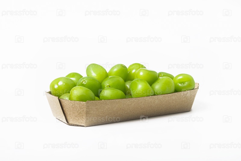 Свежие зеленые виноградные лозы в картонной коробке на белом фоне. изолированный. боковой вид