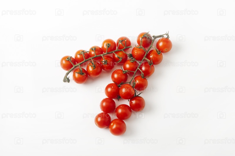 Свежие красные вишневые помидоры на ветке на белом фоне. изолированы. вид сверху