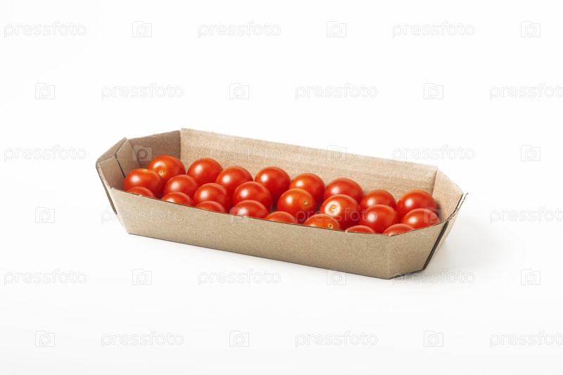 Свежие красные вишневые помидоры в картонной коробке на белом фоне. изолирован