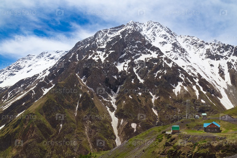 Горный пейзаж весной, с небольшими зданиями у подножия горы