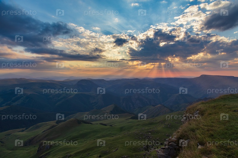 Прекрасный пейзаж с закатом солнца в горах Северного Кавказа