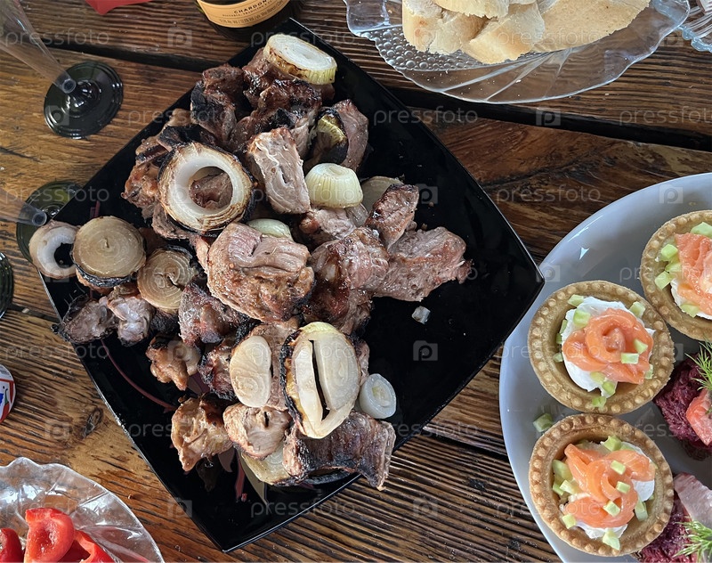На деревянном столе есть вкусный кебаб на тарелке