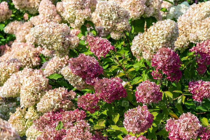 Розовые и белые цветы гортензии полностью расцветают в саду