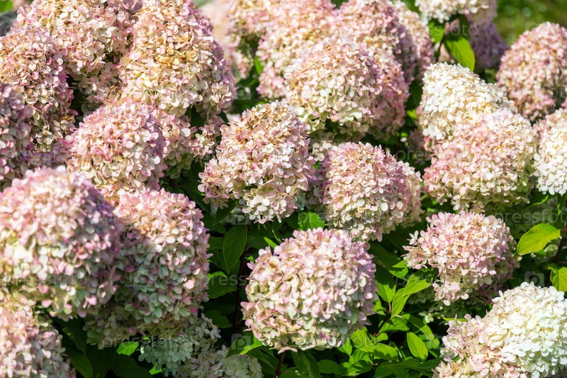 Розовые и белые цветы гортензии полностью расцветают в саду