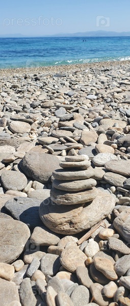 Пирамида камней разных размеров на пляже. Берег моря усеян округлыми камнями различных размеров и оттенков серого и бежевого цвета. Символ спокойствия, гармонии и равновесия