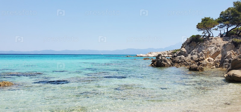 Пляж Мега Портокали, расположенный на восточном побережье полуострова Сифония, Греция. чистый и мягкий песок, чистая вода и большие камни. отдых на море или океане. летние каникулы или путешествия