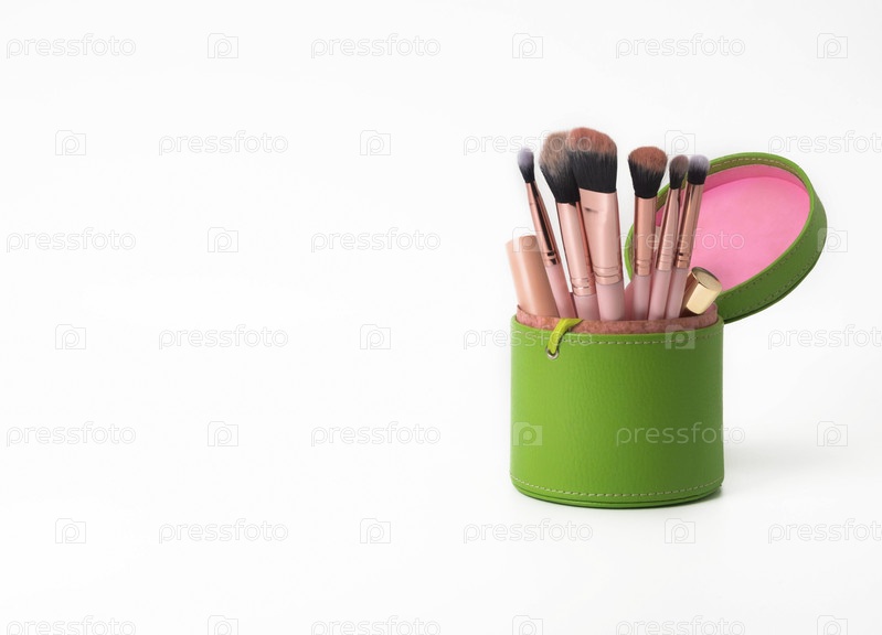 Деликатное зелено-розовое тело содержит косметические щетки, маскару, глазный глянс и тени для глаз. Объект изолирован на белом фоне