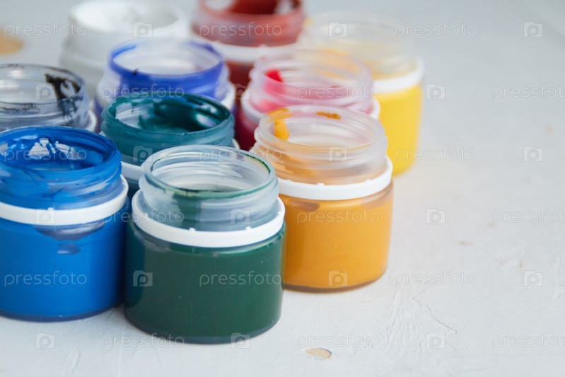 Красочная акриловая краска в банке, серый грязный фон, фотоматериалы художников