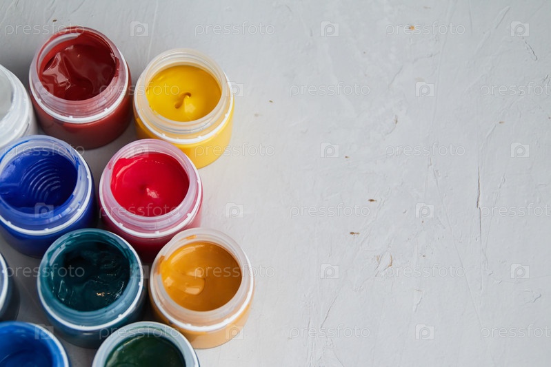 Красочная акриловая краска в банке, серый грязный фон, фотоматериалы художников