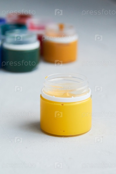 Красочная акриловая краска в банке, серый грязный фон, фотоматериалы художников