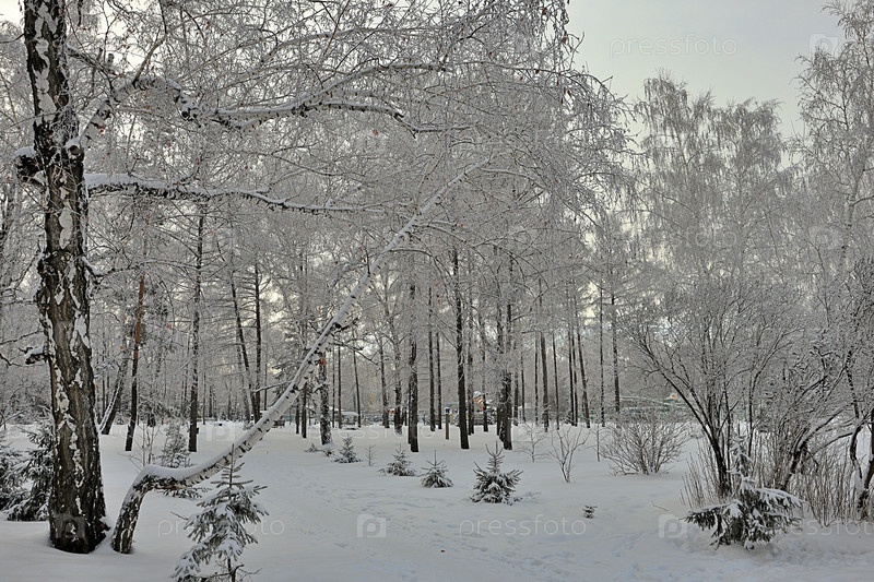 Деревья в морозе в городском парке