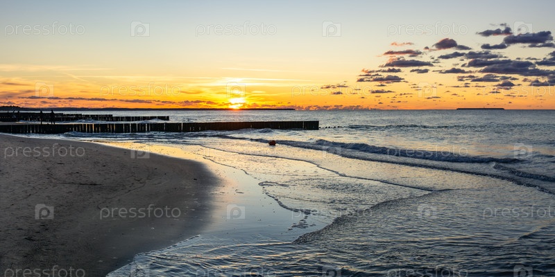 Песчаный пляж на набережной Зеленоградска с видом на закат