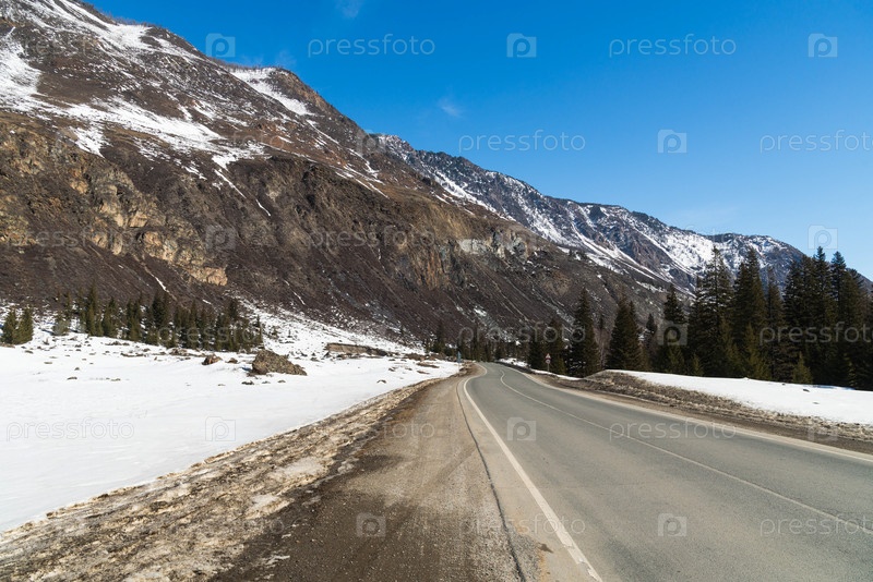 Пустынная автомагистраль, извивающаяся через заснеженный горный пейзаж. Улаганский участок. Гора Алтай