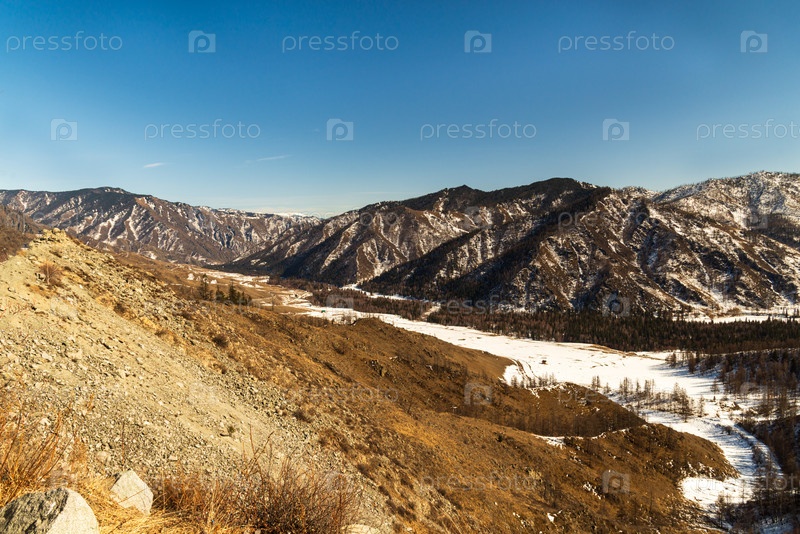 Живописный пейзаж горного хребта со снежной долиной и чистым голубым небом. перевал Чике-Таман. гора Алтай