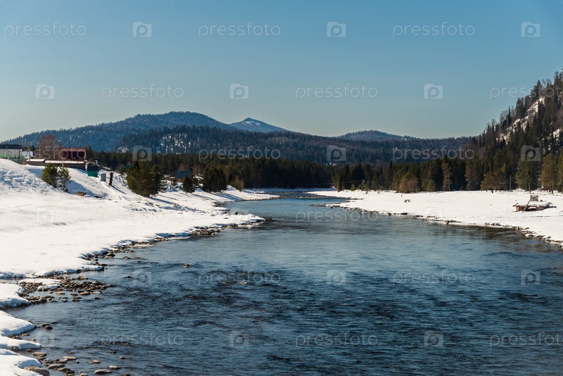 Прозрачная река Биа течет через снежный зимний ландшафт с сосновым лесом и далекими горами под синим небом
