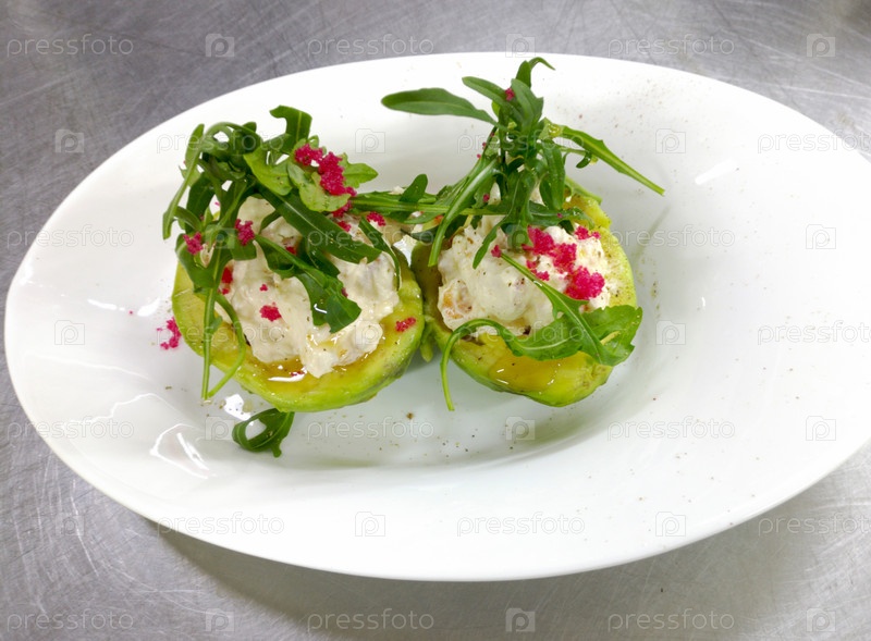 Рафинированная закуска: половинки авокадо, наполненные сливком, кремообразная начинка морепродуктов, украшены свежей ругулой и посыпаны ярко-розовым кайваром