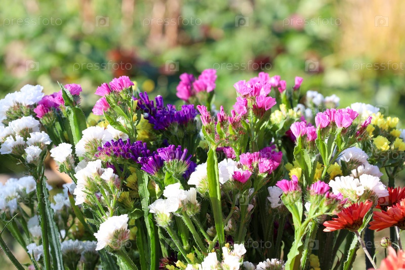 Сушеные цветы - статистика или цветение кермека в саду на размытом фоне