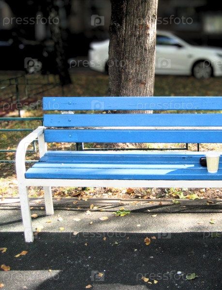 Голубая городская скамейка у дерева с одноразовым стеклом на солнечной улице