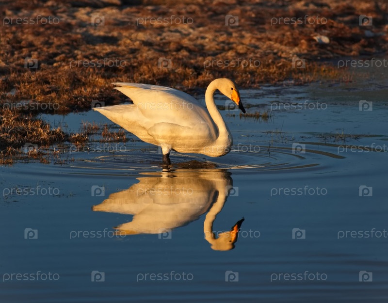 Юг Западной Сибири, Алтайские горы. грациозный лебедь-кликун в лучах заката весеннего неба питается в деревенском озере после сложного полета