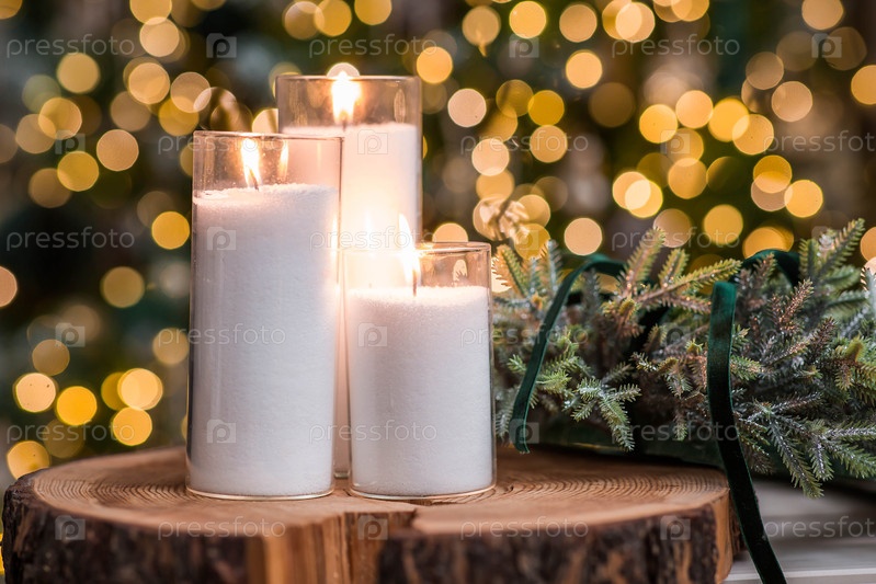 Свеча на столе в гостиной и рождественский венок. новогоднее украшение интерьера. концепция подготовки дома к Рождеству и Новому году. канун Рождества