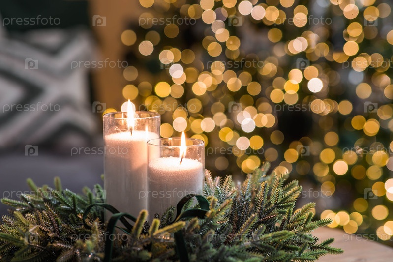Свеча на столе в гостиной и рождественский венок. новогоднее украшение интерьера. концепция подготовки дома к Рождеству и Новому году. канун Рождества