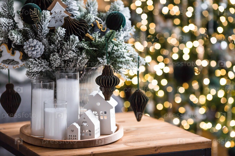 Белые керамические дома, букет рождественской елки и свечи на столе в гостиной.Концепция подготовки дома к Рождеству