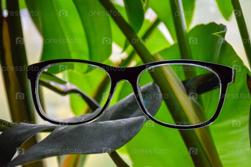 Очки с прозрачными линзами лежат среди зелени
