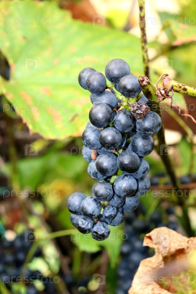 Группа спелых голубых виноград с увядшими ягодами на ветке лозы в саду в солнечный осенний день