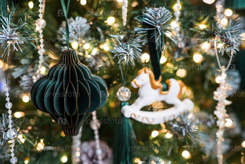 Новогодний баннер. Символом года является лошадь. Стильные украшения рождественской елки в интерьере дома. Зеленые тона. Концепция стильного нового года и Рождества 2026
