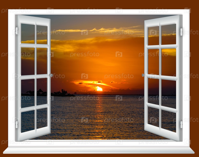 Открытое окно Вид на закат над океаническими волнами