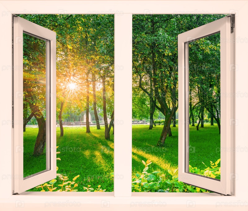 Открытое окно с видом на солнечный лес утром