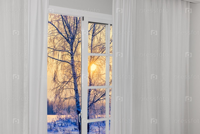 Зимний пейзаж в больших стеклянных дверях