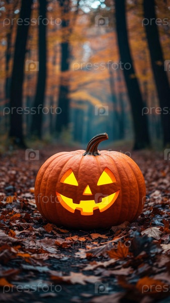 Светящийся тыквенный фонарь на фоне осеннего леса