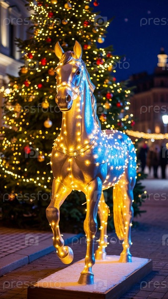 Статуя лошади на городской площади на фоне украшенной рождественской елки