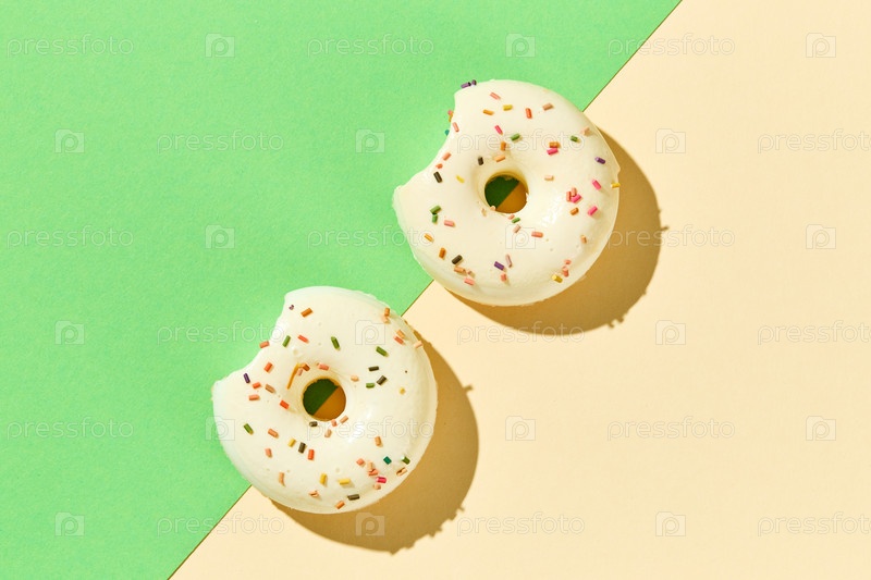 Вид сверху на различные пончики конфетти, расположенные на цветном фоне