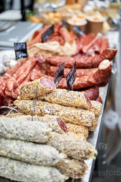 На прилавке продают колбаски на уличном рынке
