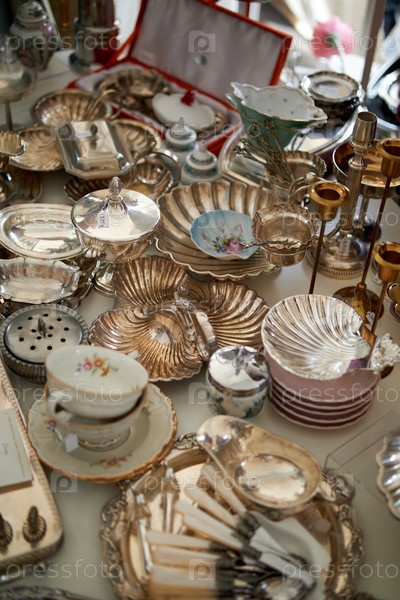 Античные серебряные чайники, крем и другие принадлежности на уличном блошином рынке
