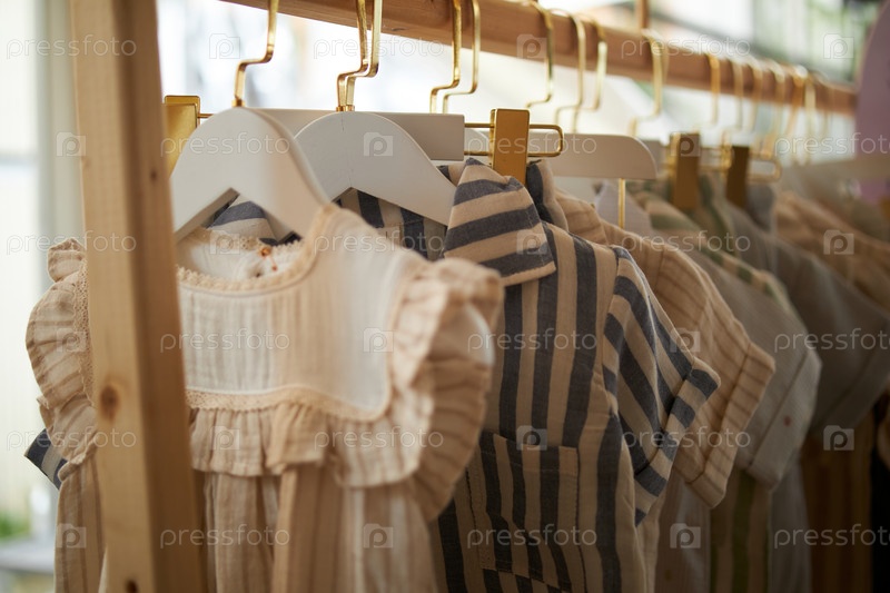 Детская одежда на вешалки из натуральных тканей, спокойные пастельные тона в экологически чистом и ретро стиле