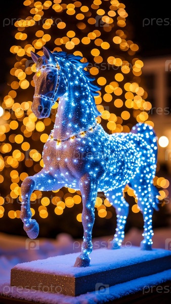 Новогодняя световая фигура лошади стоит на фоне новогодних огней