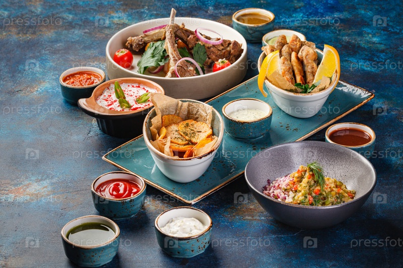 Несколько блюд из курицы, рыбы, картофеля, различных салатов и соусов