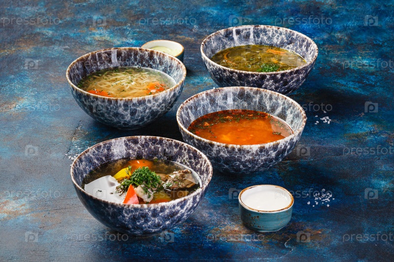 Различные супы и колбасы из разных стран родственники с овощами или мясом
