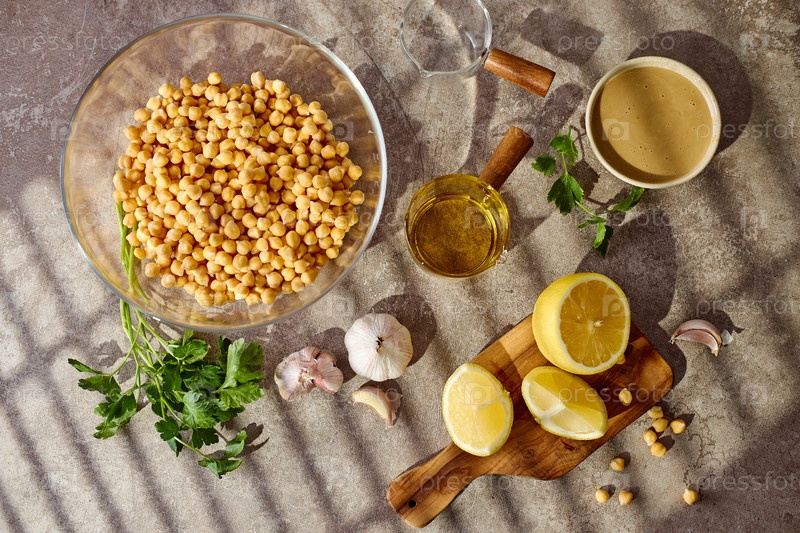 Гранат, лимон, тахини и травы - ингредиенты для приготовления хумуса