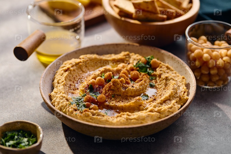 Вкусный хумус с оливковым маслом, горохом и петрушкой