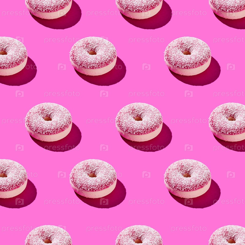 Вид сверху пончиков конфетти на розовом фоне