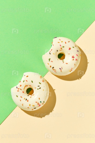 Вид сверху на различные пончики конфетти, расположенные на цветном фоне