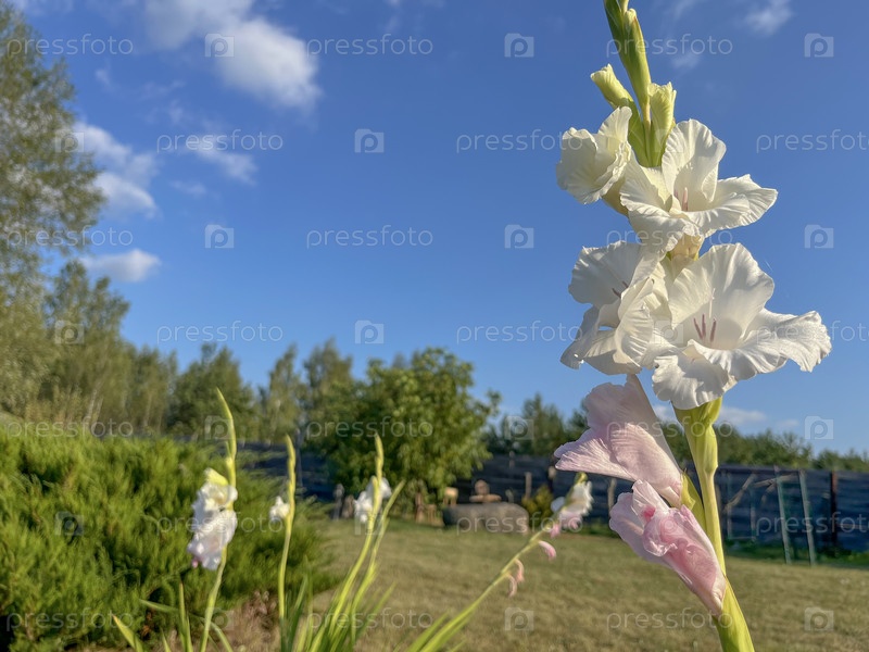 Летом белые гладиолы цветут на голубом небе