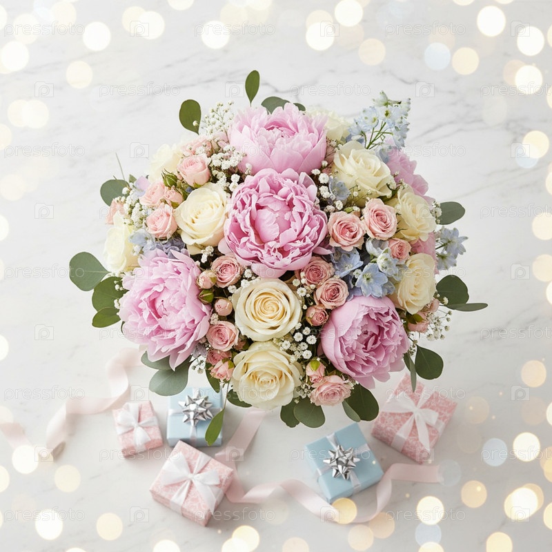 Цветы и подарки на мраморном столе