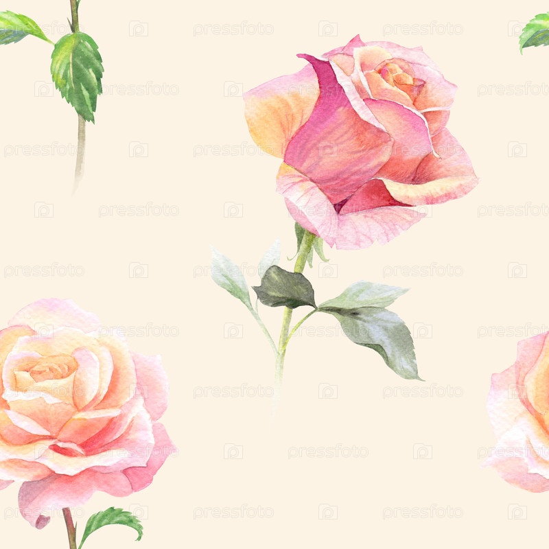 Бесшовный рисунок роз на бежевом фоне. Иллюстрация акварельных красок ручной работы. Для дизайна упаковки, карт, обложек, принтов, этикеток продуктов и тканей