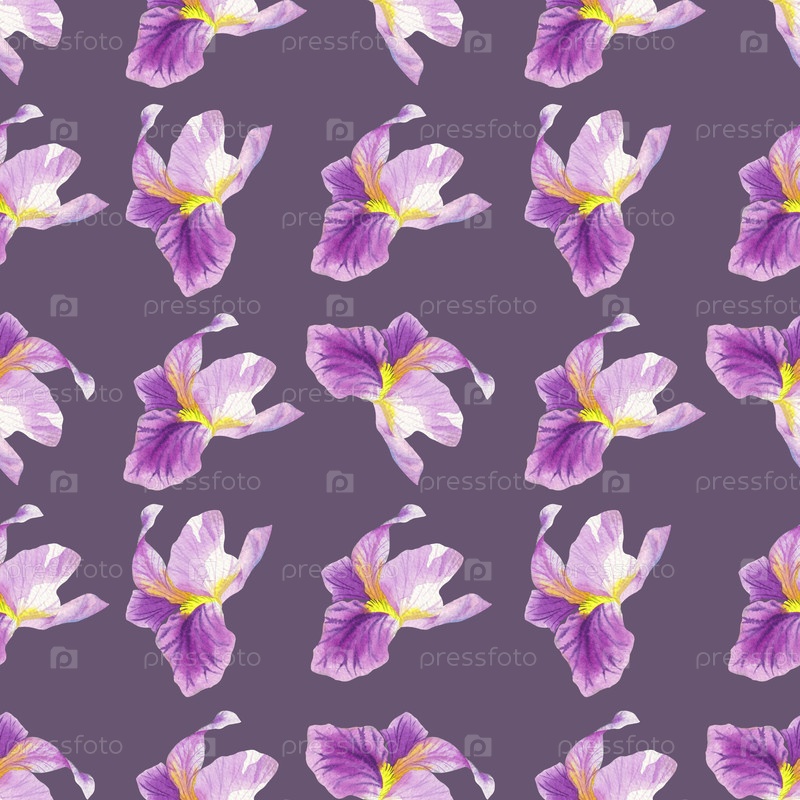 Бесшовный рисунок ирисов. Иллюстрация акварельных красок ручной работы. Для дизайна упаковки, карт, обложек, принтов, этикеток на продуктах и тканей